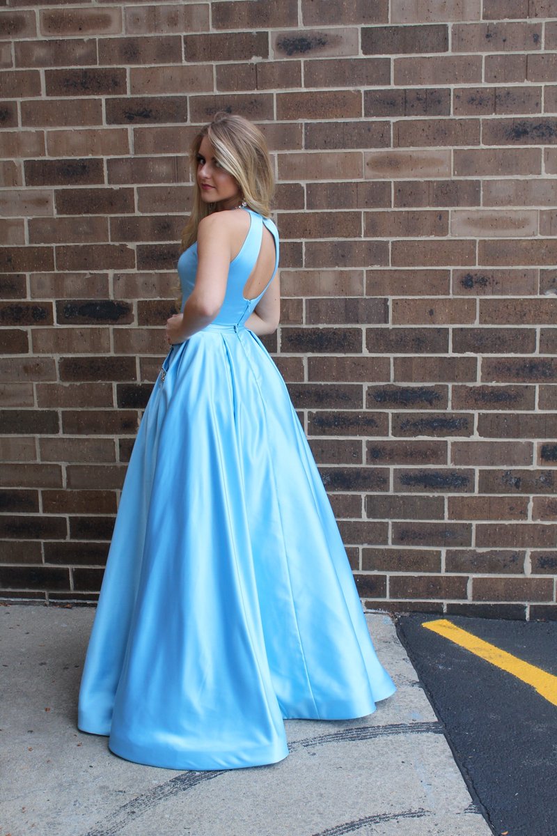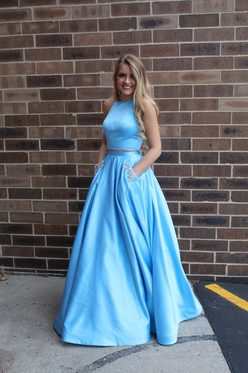 Sky Blue A Line Satin Prom Dresses Two Pieces Beading Evening Formal Gowns with Pocket