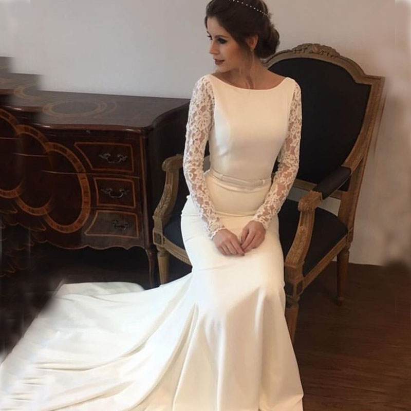 New arrival Wedding Dresses Satin lace long sleeves Wedding Bridal Gowns Sweep Train vestido de noiva sheer beach wedding guest