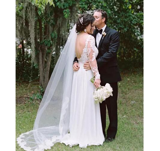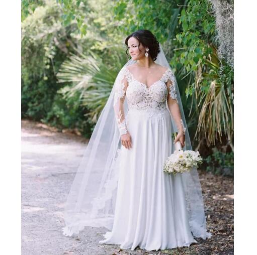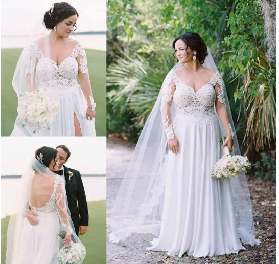 Lace Plus Size Wedding Dresses With Sleeves Sheer Bateau Neck A-Line Backless Bohemian Wedding Dress Split Chiffon Beach Bridal Gowns