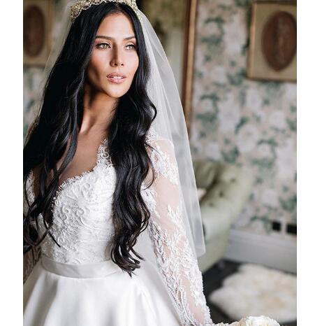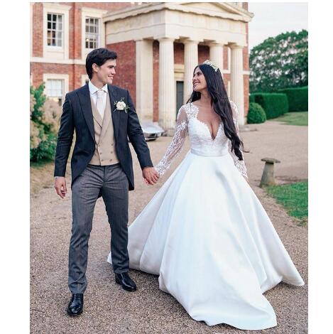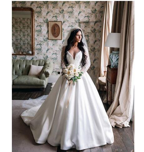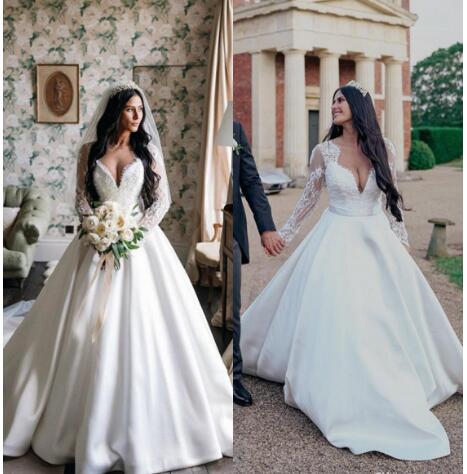 Bohemian New Arrival Long Sleeve A Line Wedding Dresses Lace Satin V Neck Bridal Gowns Zipper Sweep Train Wedding Gowns
