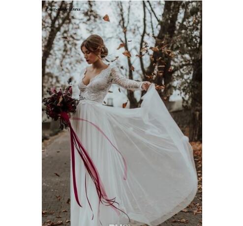 Wedding Dress Long Sleeves V-Neck Long Beach Bridal Gowns Floor Length Appliques Zipper Back Simple Robe De Mariee