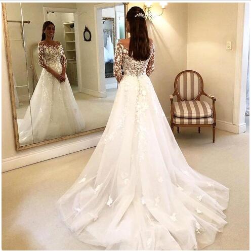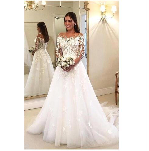 New Arrival 3D Appliques Lace A Line Wedding Dresses Sheer Neck Long Sleeves Tulle Classy Bridal Gowns Brides Dress Vestido De Novia