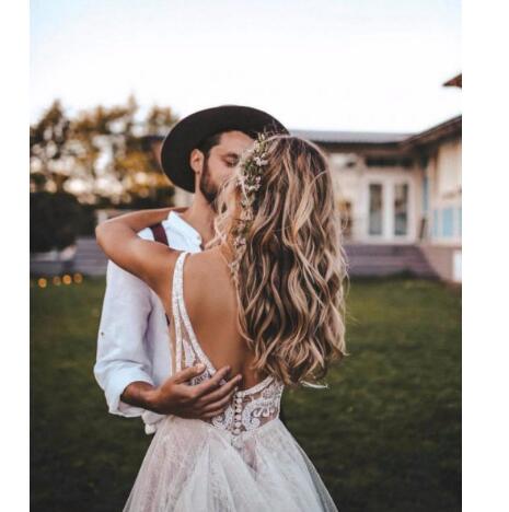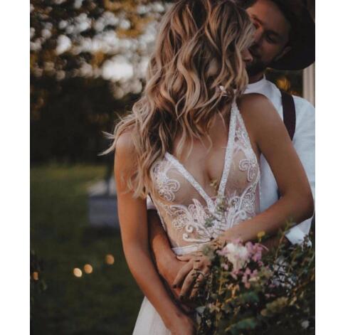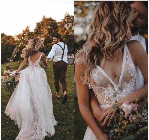 Sexy Deep V Neck Grande Wedding Dresses Tulle Backless Lace Appliques Sleeveless Sweep Train Boho Bridal Dresses