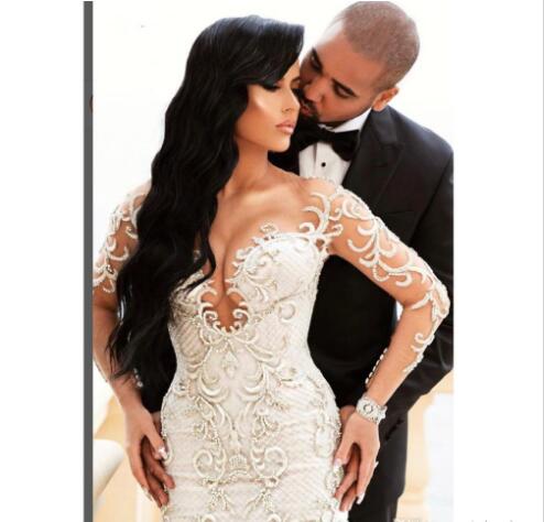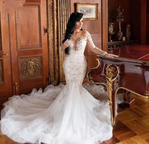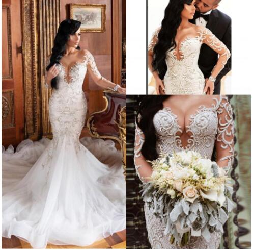 Elegant Lace Mermaid Wedding Dresses Arabic Sheer Scoop Neck Applique Beaded Plus Size Bridal Wedding Gowns Vestidos De Novia