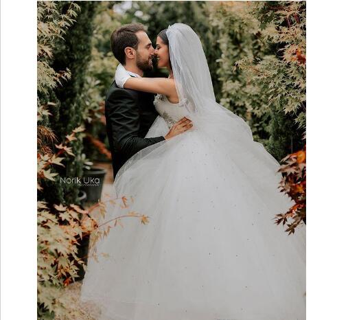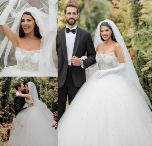 Modest Bohemian Strapless Sleeveless Ball Gown Wedding Dresses Tulle Lace Applique Crystal Wedding Gowns Sweep Train robe de mariée