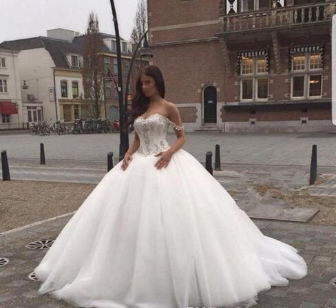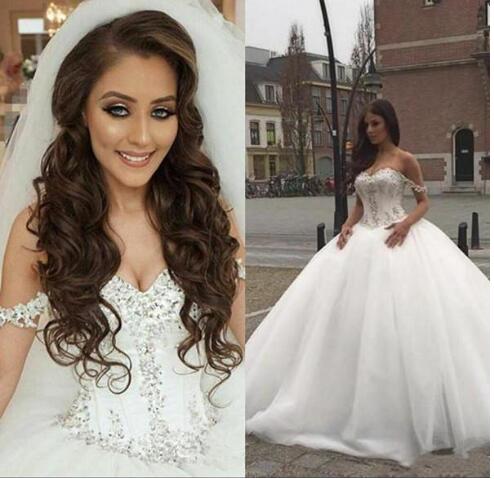 Ball Gown Wedding Dresses Off Shoulder Crystal Beaded Tulle Bridal Gowns Sweep Train Plus Size Wedding Gowns