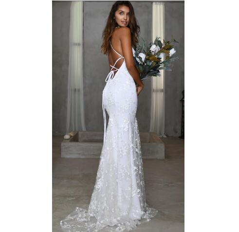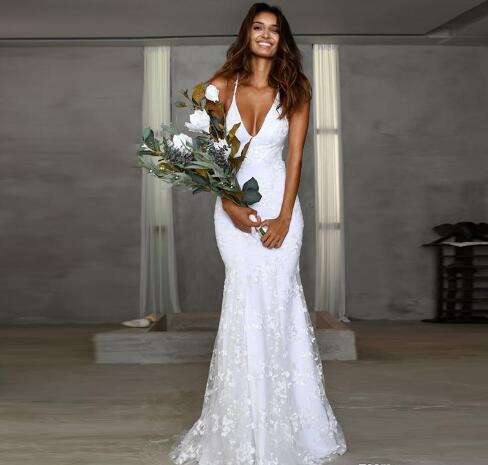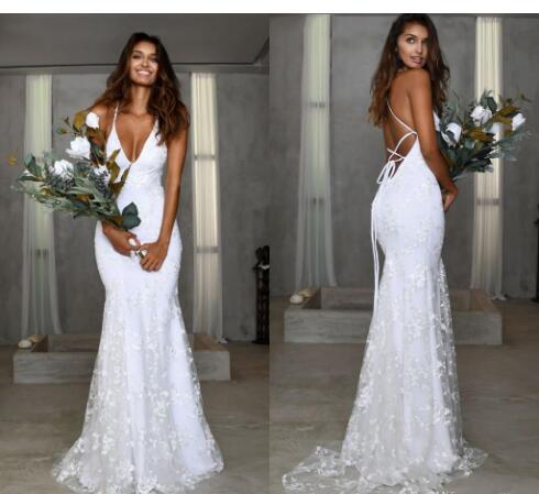 Halter Sexy Mermaid Wedding Dresses Boho Lace Appliques Long Bridal Gowns Criss Cross Back Sweep Train Wedding Gown Plus Size