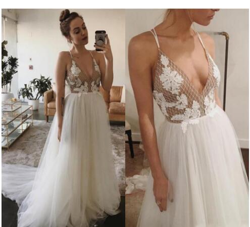 Spaghetti Beach Wedding Dresses A Line Lace Appliqued Tulle Boho Wedding Dress Custom Made Bohemian