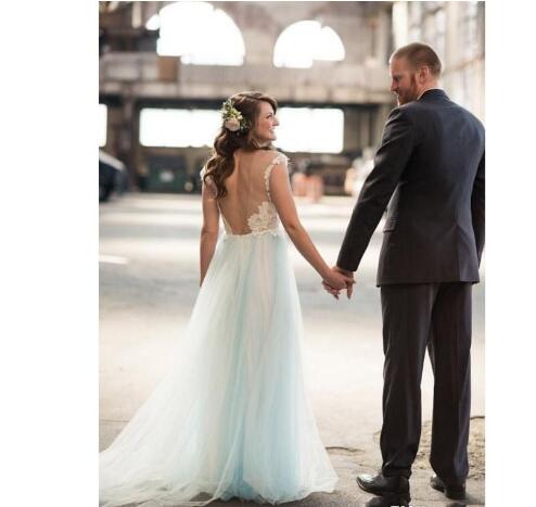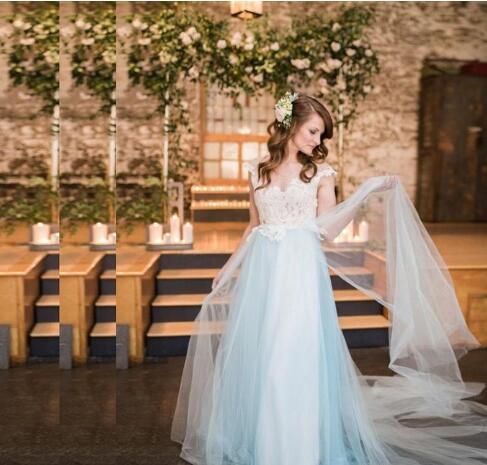 White Lace Blue Tulle Wedding Dresses Cap Sleeve Sheer Neck Bridal Gown V Backless Rustic Bride Dress Bohemian Court Train Wedding Gown