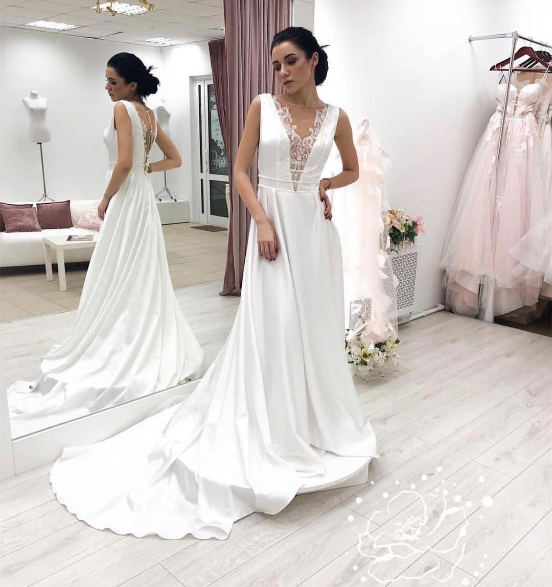 Modest Wedding Dresses A-Line White Satin Court Train Modern Wedding Dresses Lace Appliques Covered Buttons vestidos de noche Bridal Gowns
