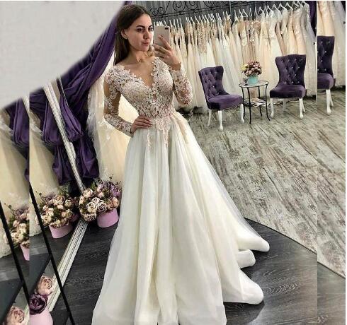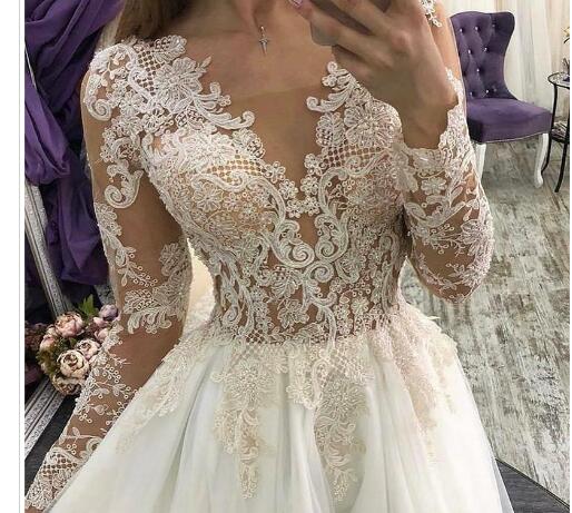 Vestidos De Novia Long Sleeves Wedding Dresses 2020 A Line Lace Applique Beaded Formal Bridal Gown Plus Size Sweep Train Tulle Skirt