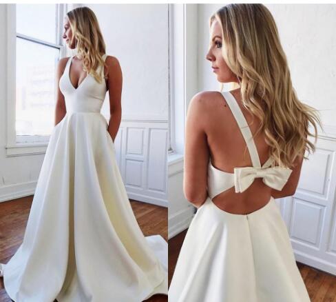Wedding Dresses With Pockets Sexy Bow Backless A Line Satin Summer Garden Bohemian Bridal Gowns Custom Made