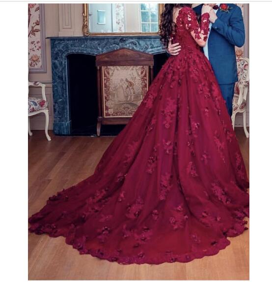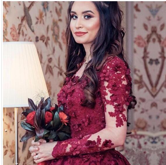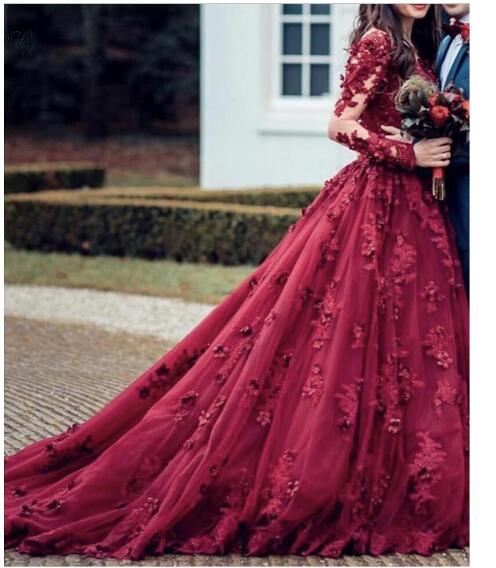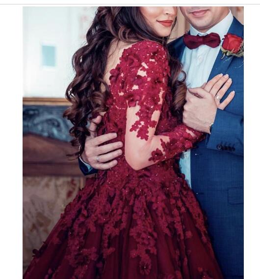 3D Flower Lace wedding Dresses Sheer Crew Full Sleeves Vintage Burgundy Beaded Muslim Bridal Gowns Robe De Mariee