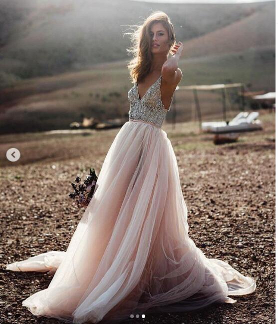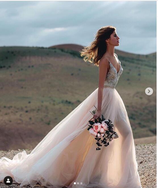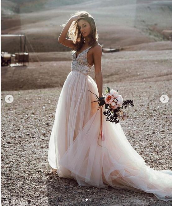 Blush Pink Tulle Wedding Dresses Beading Bohemian Bridal Gowns