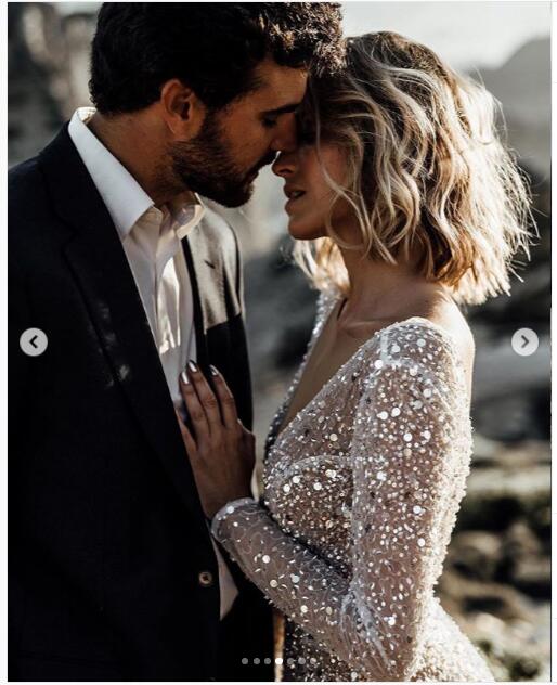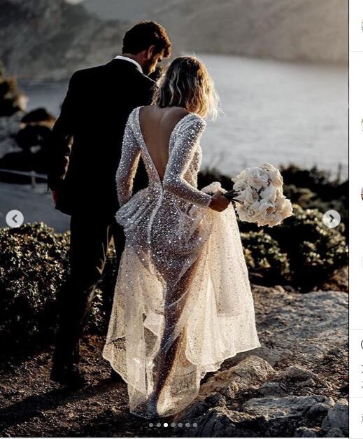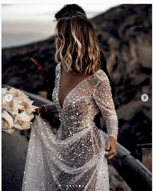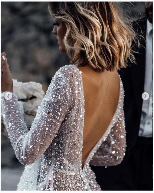 Luxury A Line Tulle Wedding Dresses Crew Neck Sheer Long Sleeve Beach Bohemian Bridal Gowns