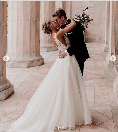 Elegant Ball Gown Sexy Deep V Neck Lace Bodice Bridal Gowns