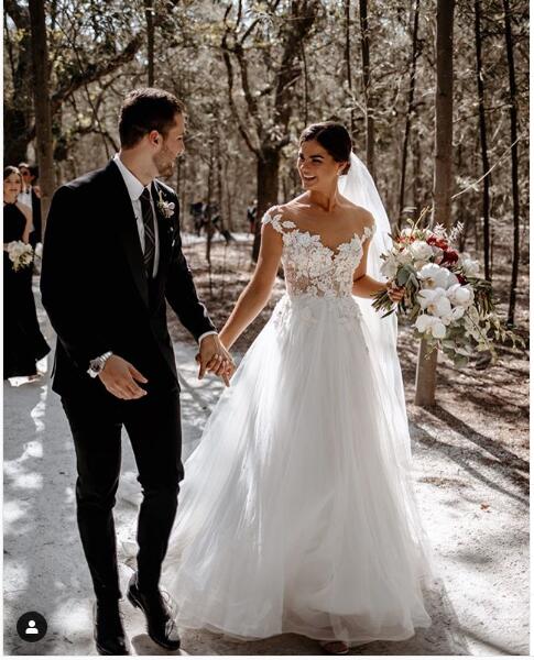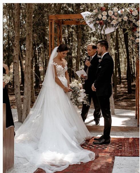 Ball Gown Tulle Wedding Dresses Crew Neck Lace Appliques Bridal Gowns