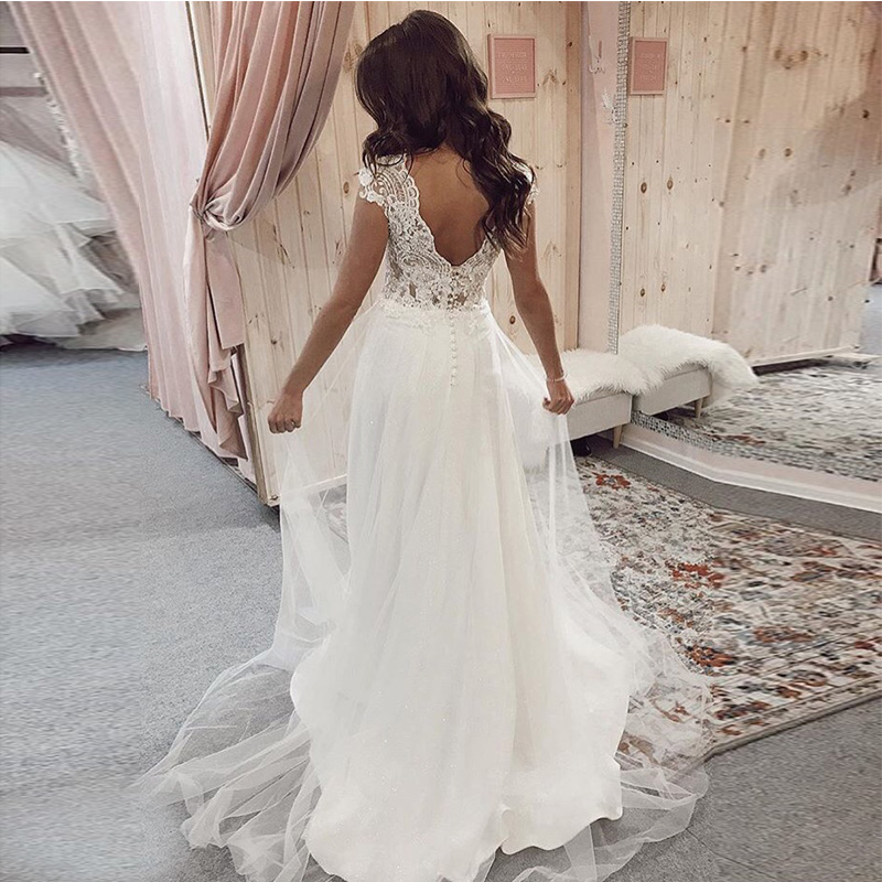 Wedding Dress Lace Appliques Tulle Long Princess Vintage Bridal Dress V Neck Wedding Gown