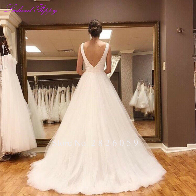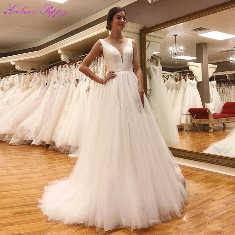 A-line V-neck Tulle Wedding Dress 2019 Floor Length Sleeveless Backless Sweep Train Satin Bridal Dress vestido de noiva