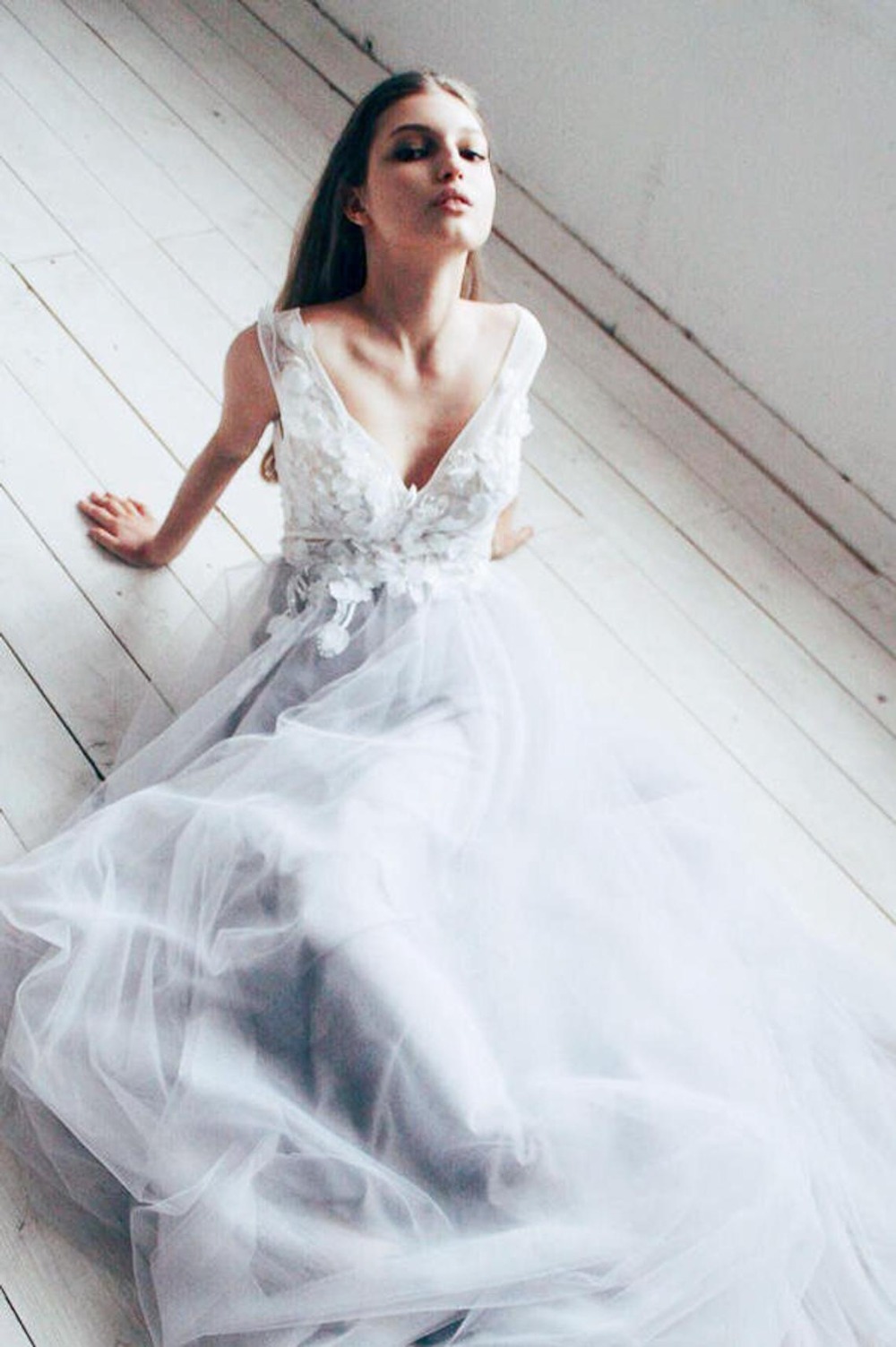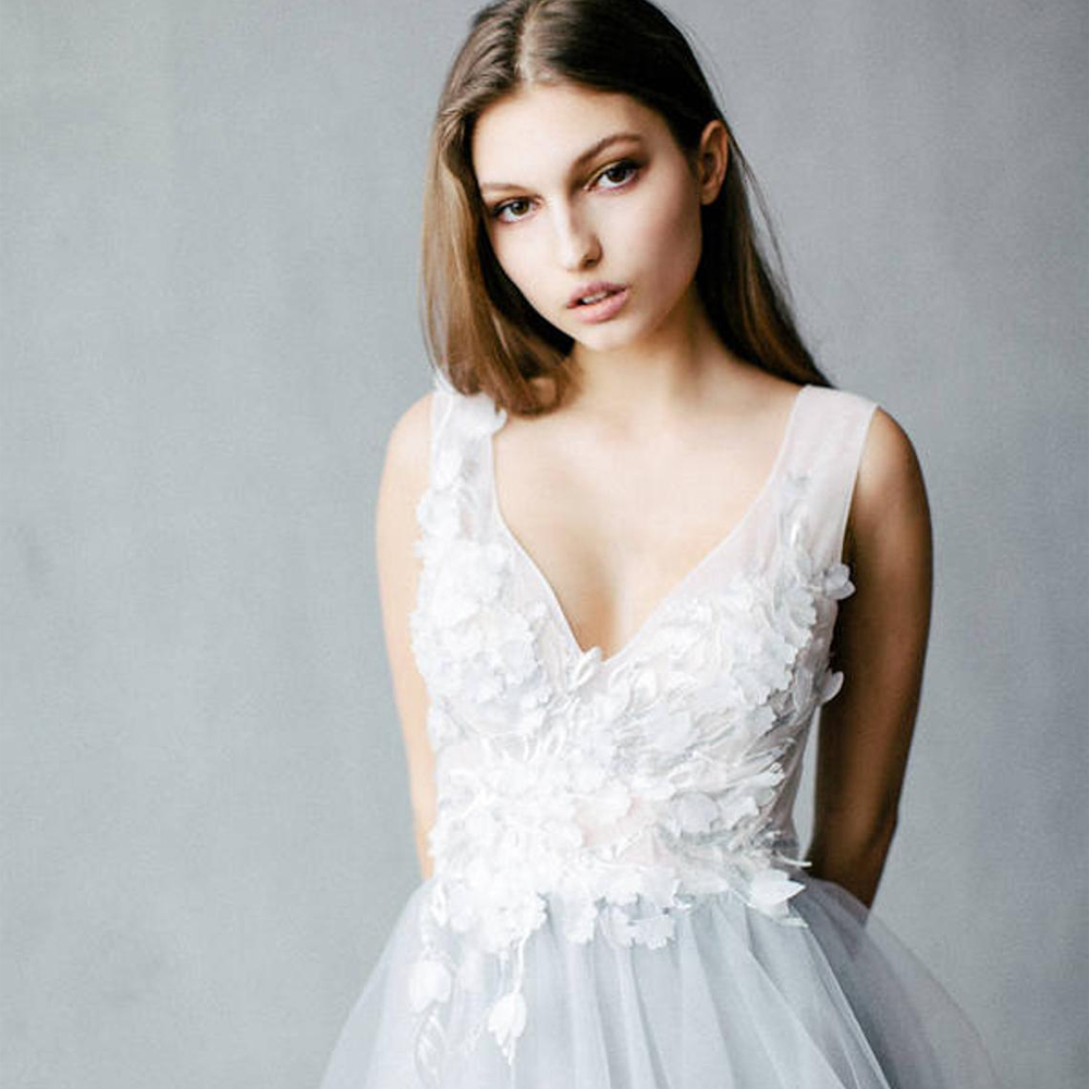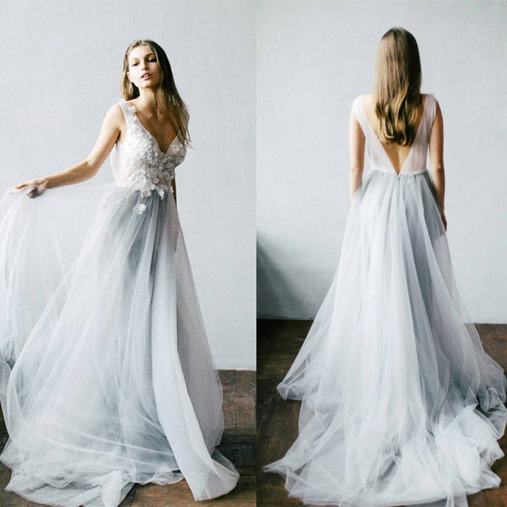 Dusty Blue Floral Wedding Dress With Tulle Skirt V-neck Bridal Gown Boho Bohemian Lorie Wedding Gowns Romantic Sleeveless Dress