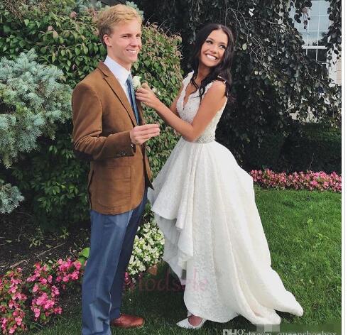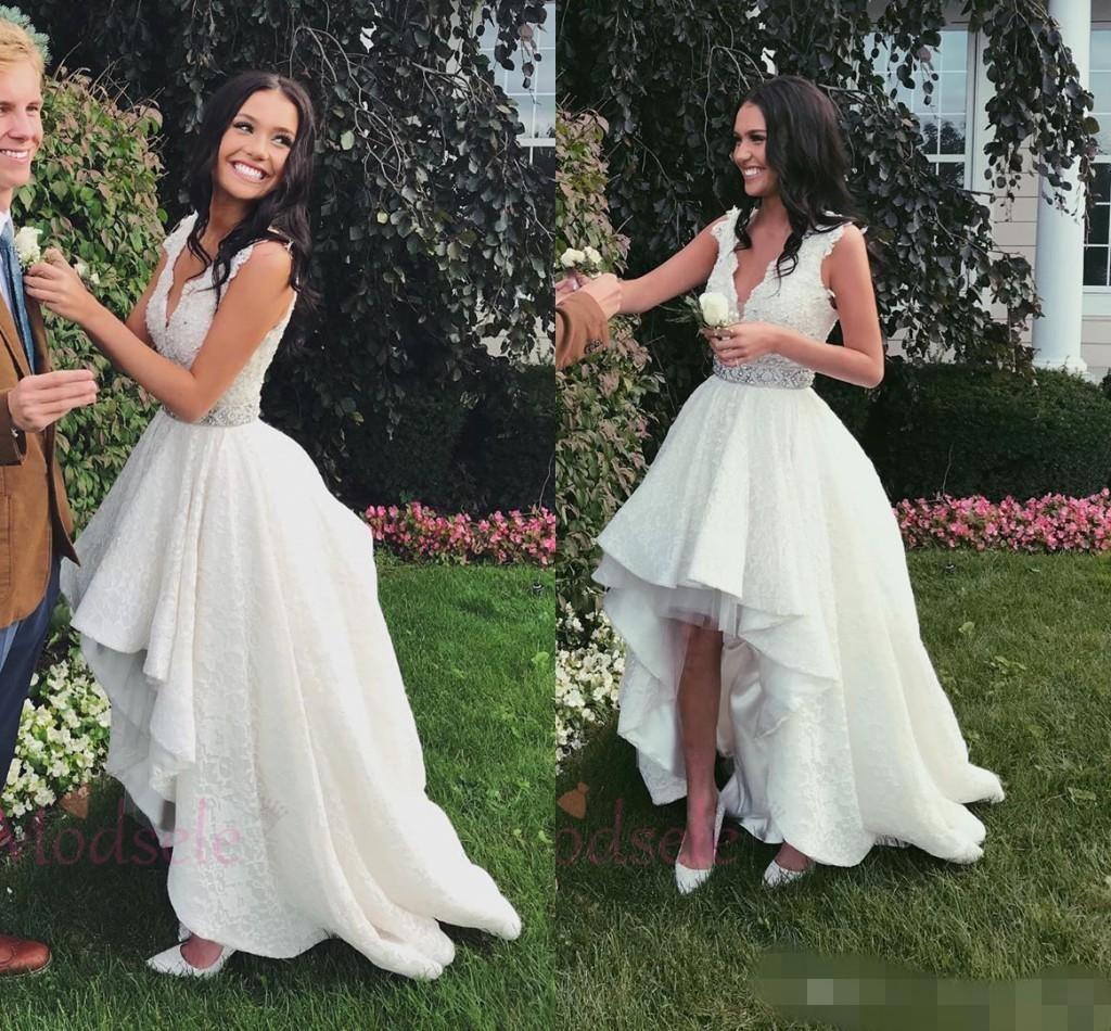Gorgeous High Low Wedding Dresses Scalloped V Neck Lace Applique Tiered Straps Sleeveless Country Wedding Bridal Gown Vestido de novia