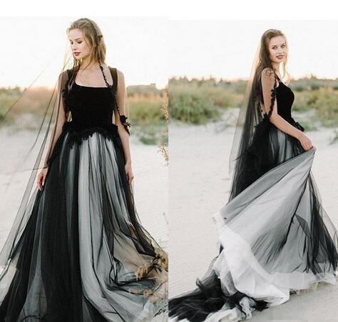 Black White Tulle A Line Wedding Dresses Lace Spaghetti Straps Sweep Train Country Bridal Gowns Open Back Plus Size Vestidos
