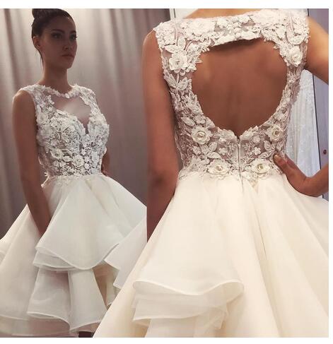 New Lovely Short Lace Sleeveless Bridal Wedding Dresses Knee Length Illusion O Neck Wedding Gowns for Bride Cut Out Back