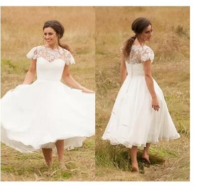 Vintage Wedding Dresses Lace Jewel Capped Sleeves Buttons Back Bridal Gowns Tea Length A Line Dress