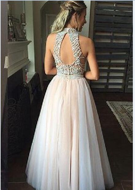 Sexy Luxury Bling Sparkle Two Pieces Prom Dress Light Pink Beaded Open Back Long 2 Piece Prom Dresses