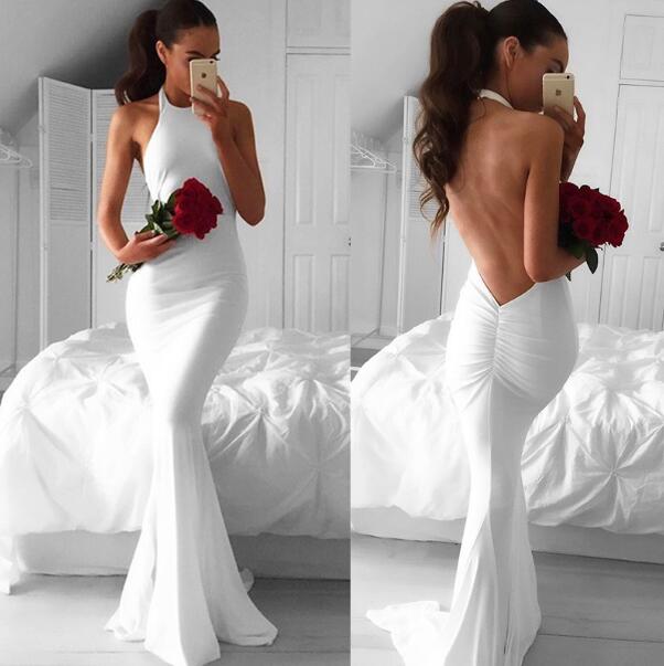 Modern White Mermaid Prom Dress,Halter Backless Evening Dresses, Sweep Train Formal Dress