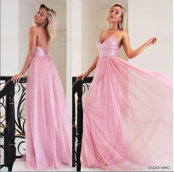 Sexy Prom Dress, Pink V-neck Prom Dresses, Long Chiffon Prom Gown Evening Dress