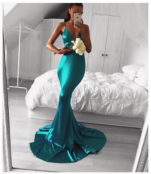 2018 Mermaid Prom Dress, Green Prom Dress, V-neck Satin Prom Dresses, Long Evening Dress Prom Gown