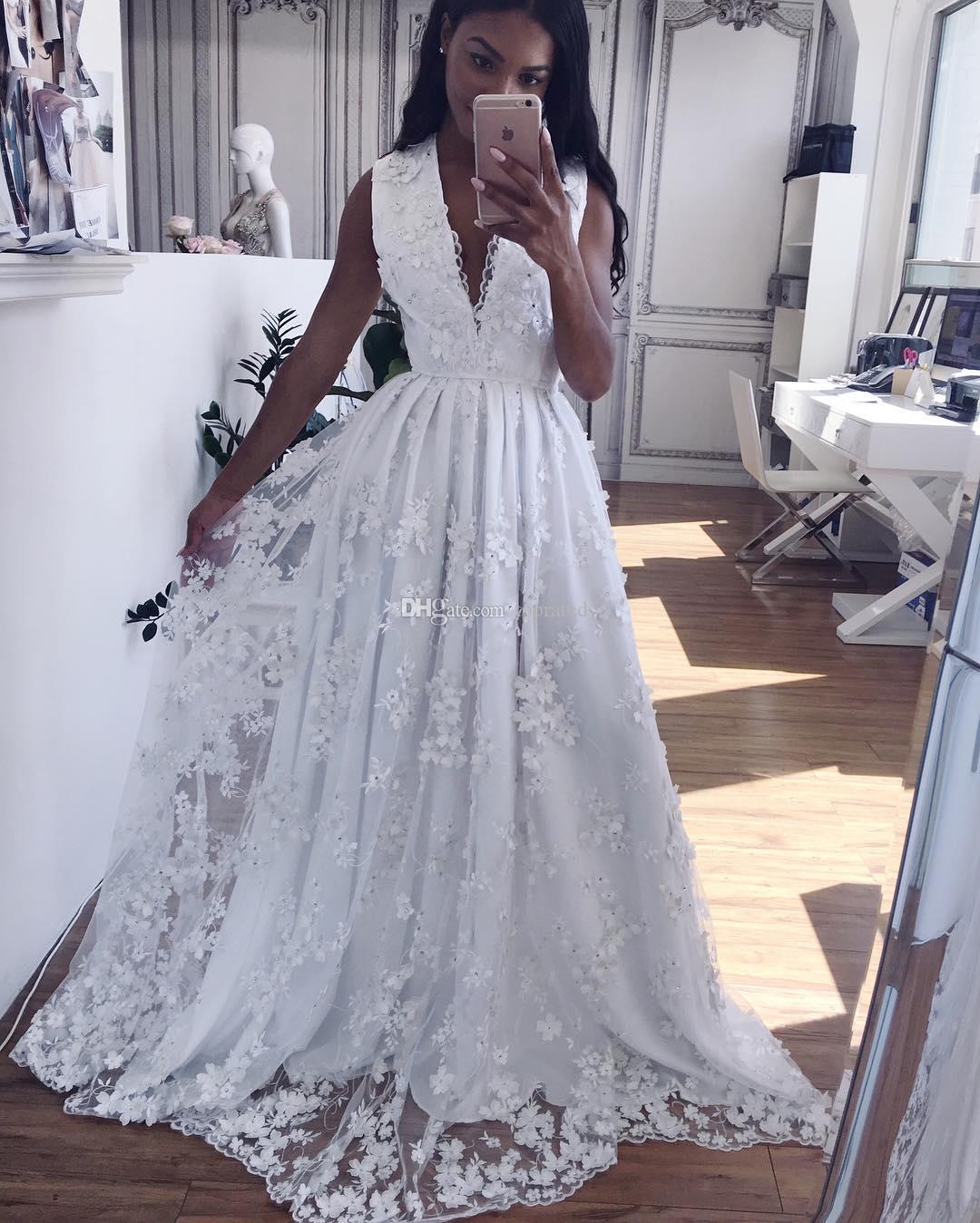2018 Luxury 3D-Floral Appliques Prom Dresses Deep V Neck Bead Flower Embroidery Dress Evening Wear Sweep Train Sleeveless Formal Party Gowns