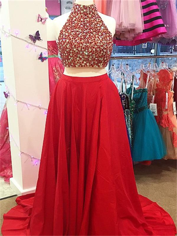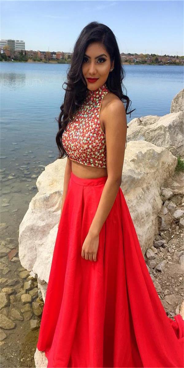 Two Pieces Prom Dress,High Neck Prom Dress,Side Silt Prom Dress,Sexy Prom Dress,Red Evening Dress , Party Dresses,Long Prom Dress,New Style Prom Gown
