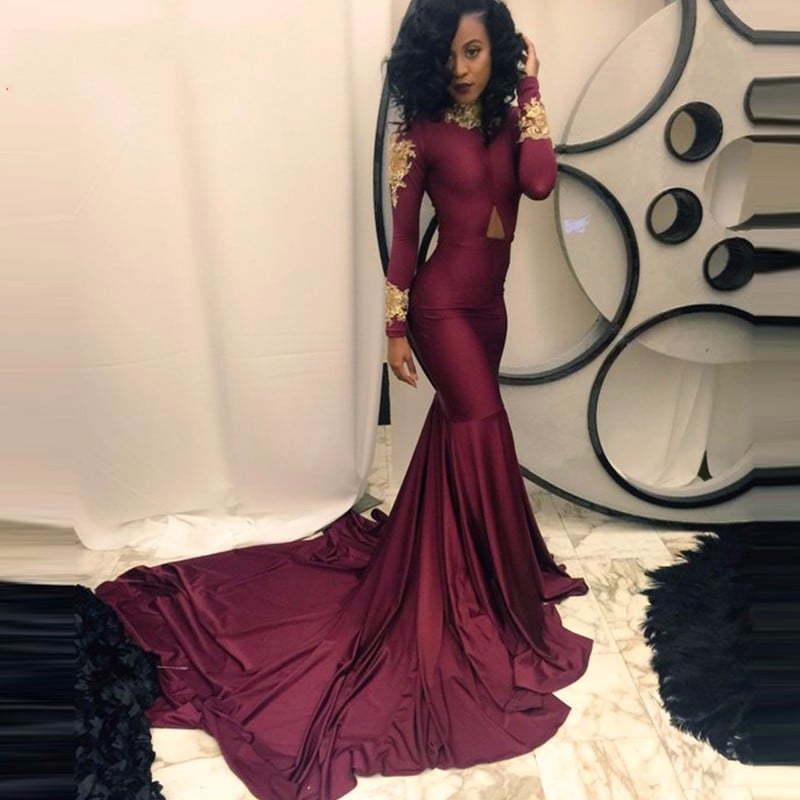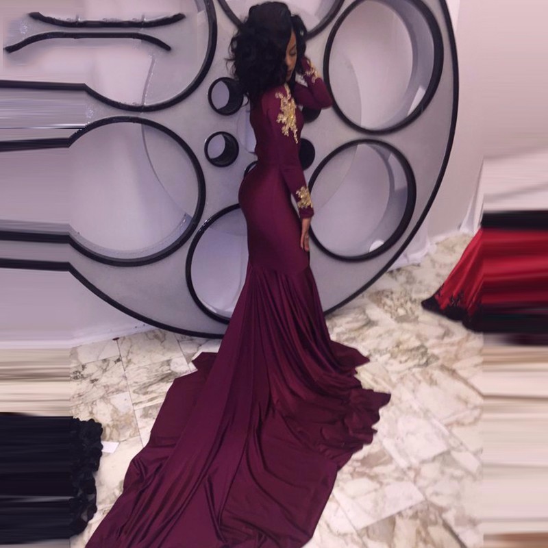 Sexy Black Girl Prom Dress Burgundy Long Sleeve Mermaid Prom Dress Gold Appliques Long Train Skirts Formal Evening Occasion Dresses