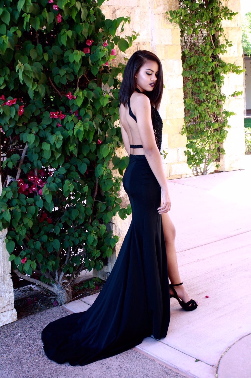 Charming Mermaid Prom Dresses Fashion Scoop Neck Sequin Black V-back Sweep Train Formal Evening Party Dress