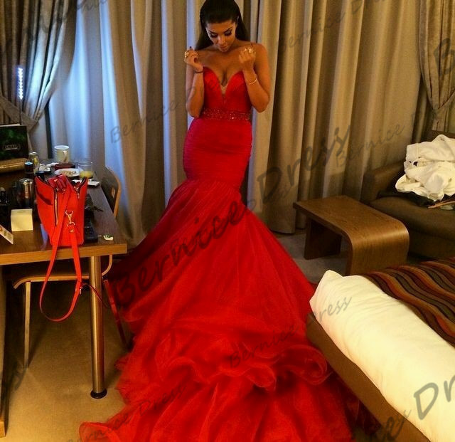 Hot Sale Sweetheart Beading Red Mermaid Satin Long Train Evening Dresses