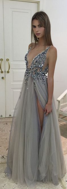 Sexy Luxury Bling Sparkle Light Grey Prom Dress Evening Dress Deep V-neck Beaded Backless Prom Dress