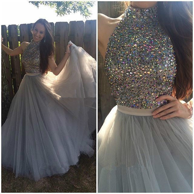 Sparkly Crystal Prom Dress Grey Halter A Line Graduation Dresses 2017 Long Evening Dress Formal Dress Tulle Sweep Train