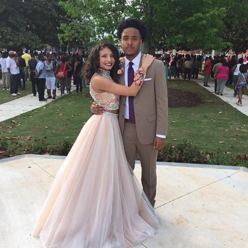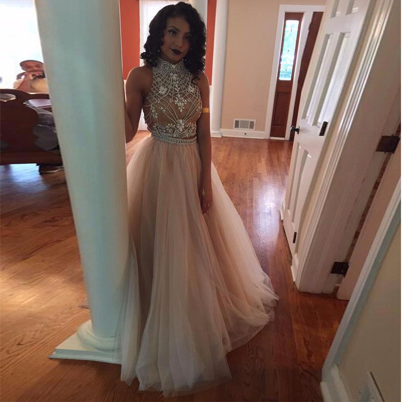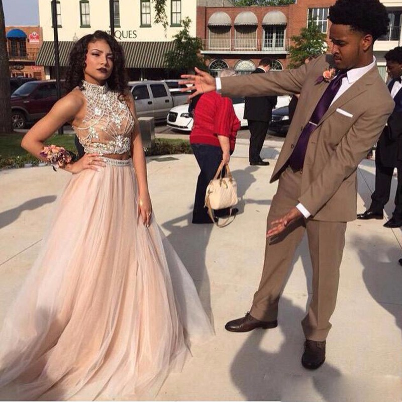 Luxury Black Girl Prom Dress New Two Pieces Crystal Beads Prom Dresses Sexy High Neck Crop Top Open Back Party Dresses Tulle Long Evening Gowns