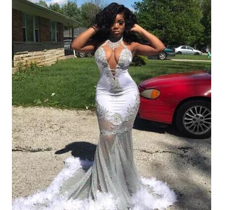 African Prom Dresses Evening Wear High Neck Sheer Neckline Mermaid Evening Gowns See Through Feather Appliques Lace Cocktail Party Dress