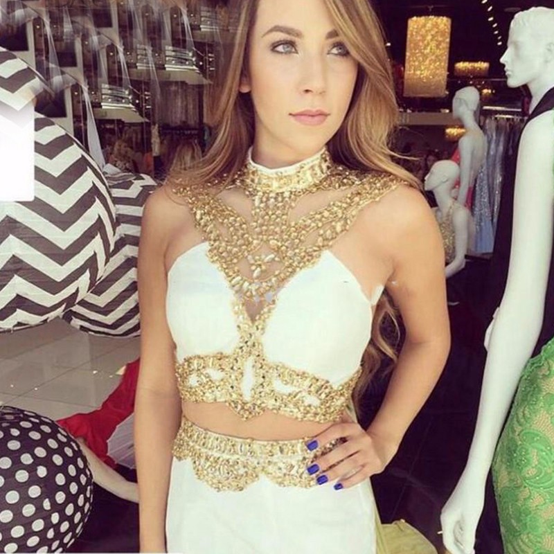 Sexy Two Pieces Prom Dress High Collar Two Pieces Prom Dress Crystals White Mermaid Evening Dresses