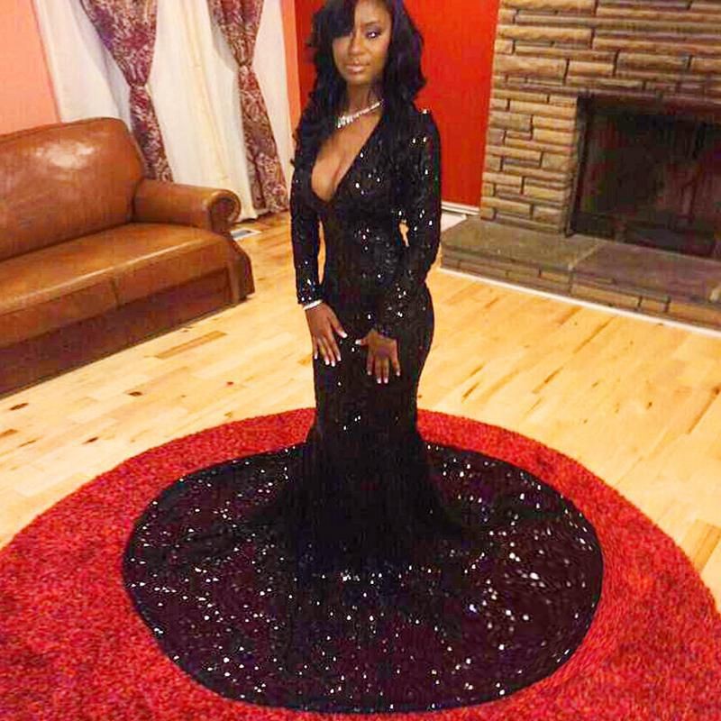 Sexy Black Girl Prom Dress Mermaid Deep V-neck Sequins Lace Long Formal Occasional Evening Dresses Prom Gown