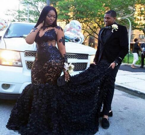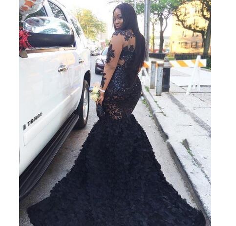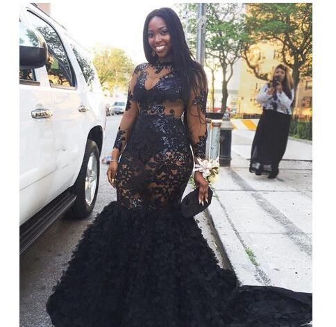 2018 African Plus Size Prom Dresses Long Appliques Sheer Neckline Mermaid Evening Gowns Sleeves Tiered Black Girls Formal Dresses Evening Wear