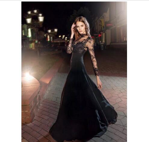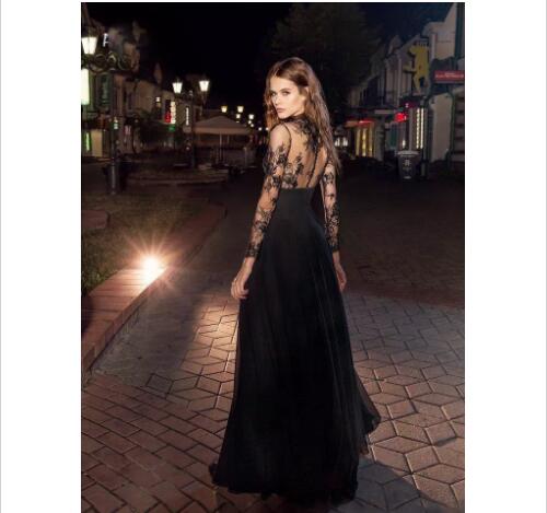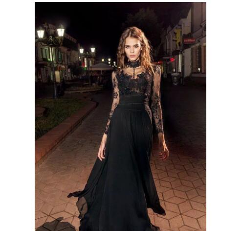 2018 Modern Black Prom Dresses Illusion Long Sleeves High Collar Lace Chiffon Evening Dress Party Wear Modern Formal Vestidos