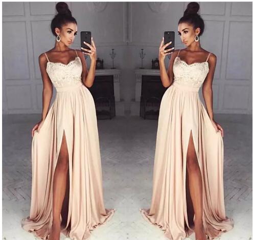 2018 Chiffon Prom Dresses, Long Spaghetti Straps Prom Dress, Side Split Sexy Cocktail Party Dress Custom Made