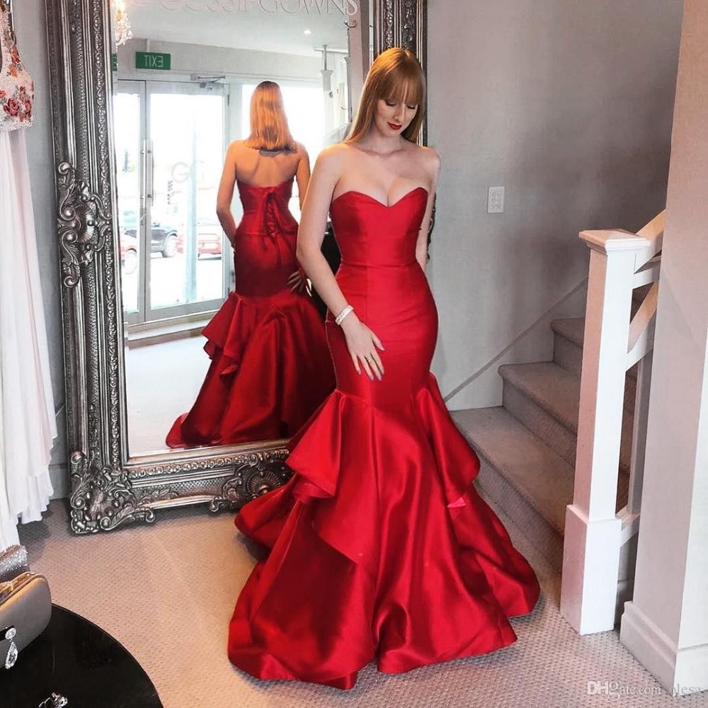 Beautiful Prom Dress Evening Dress Sweetheart Ruffles Satin Long Evening Gown Red Mermaid Prom Dress