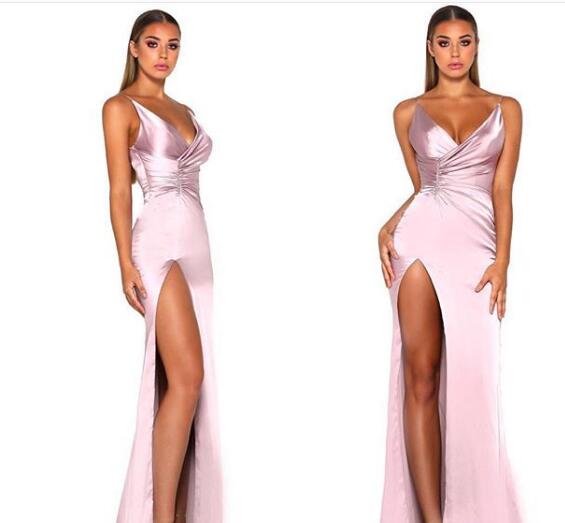 2018 Sexy Pearl Pink Prom Dress, Halter Thigh Split Evening Dress Prom Dress, Silk like Satin Prom Dresses Evening Dress Formal Dress
