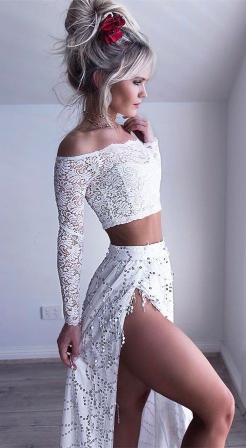 2018 Two Pieces Prom Dress, White Lace Prom Dress, Long Prom Gown