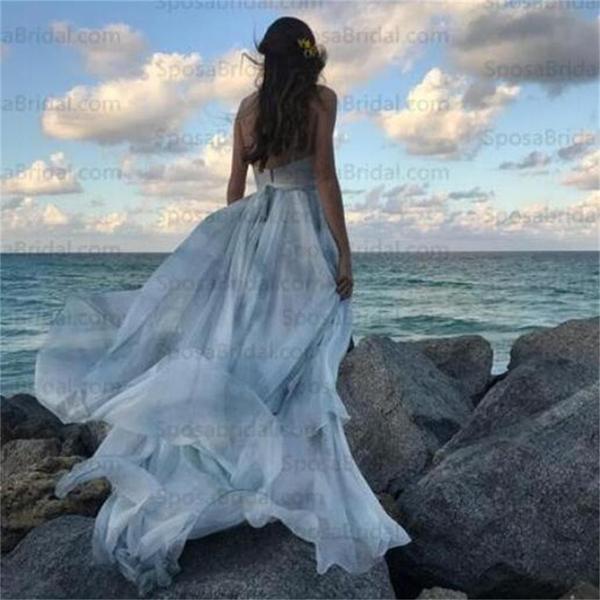 2018 Beach Prom Dress A-line Charming Long Spaghetti Straps Simple V Neck Tulle cheap Pretty Party Prom Dresses